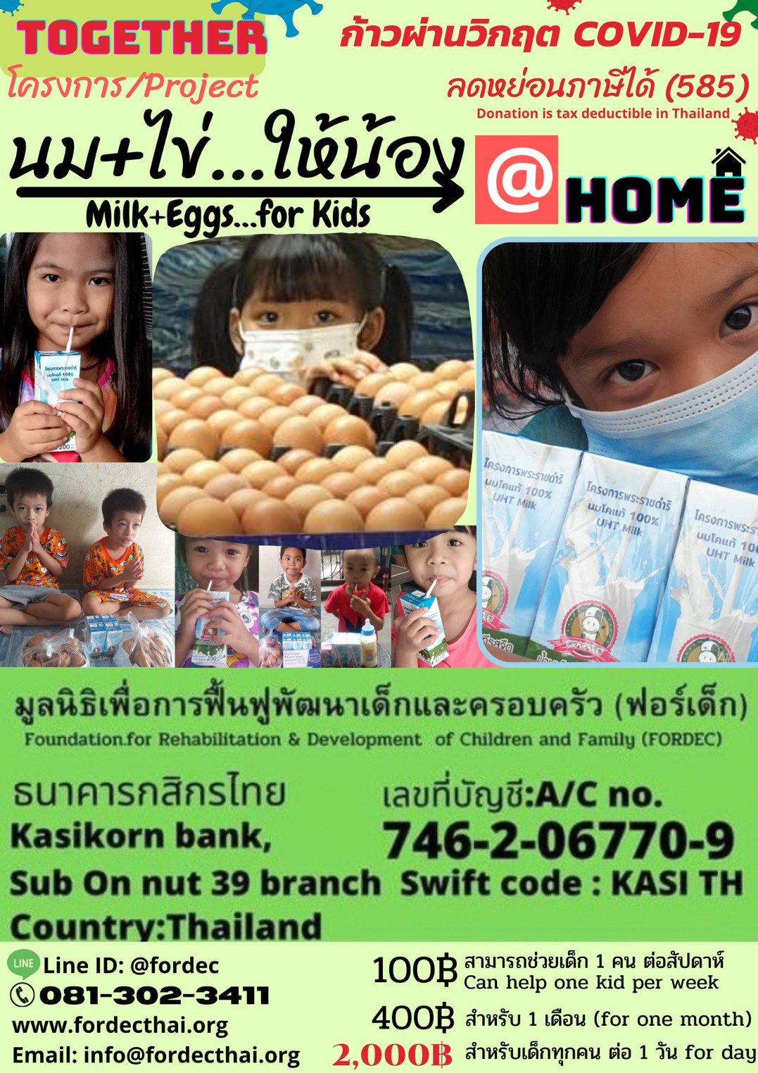 เพียง 100 บาท ท่านสามารถช่วยเหลือเด็กได้ 1 คน ให้มีนมดื่มและไข่ไก่ได้ทานทุกวัน ใน 1 สัปดาห์ หรือ 400 บาท ได้ตลอดเดือน